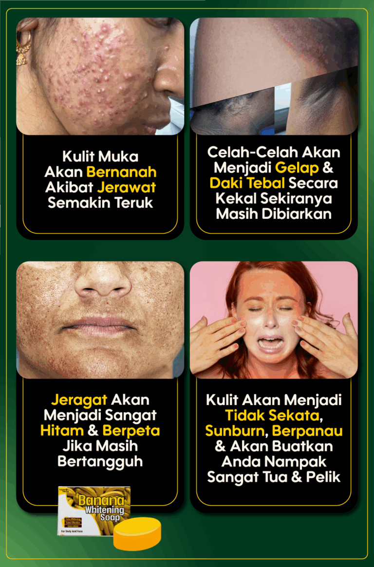 BANANA WHITENING SOAPakan settlekan masalah tu dengan mudah , sebab formula ni memang dicipta khas utk masalah seperti di atas , yang pentingSELAMAT , BERKESAN DAN SANGAT BERBALOI !